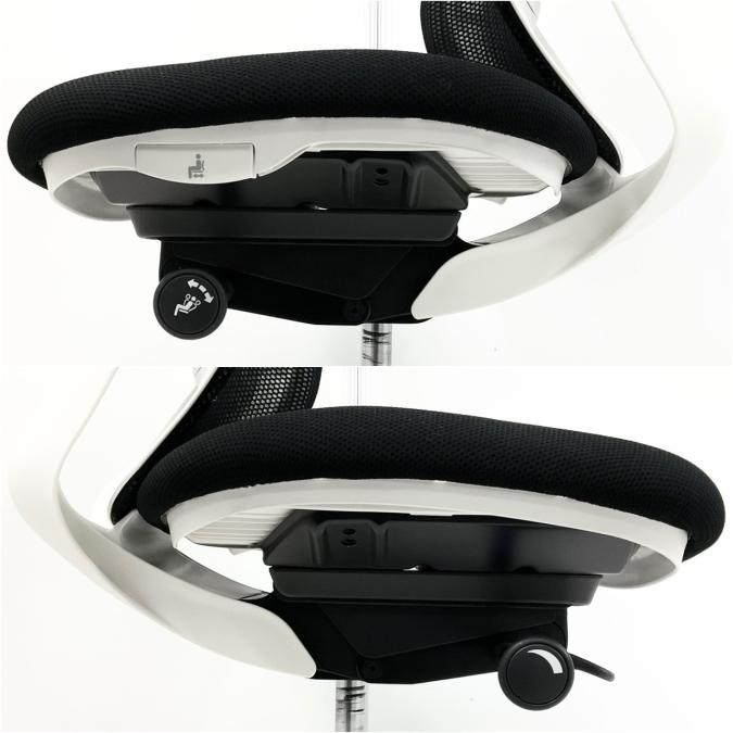 - 座面右下のダイヤル操作で、リクライニングの強弱調整が行えます。これまでのダイヤル式よりも、少ない回転数で、最弱?最強の調整が可能です。