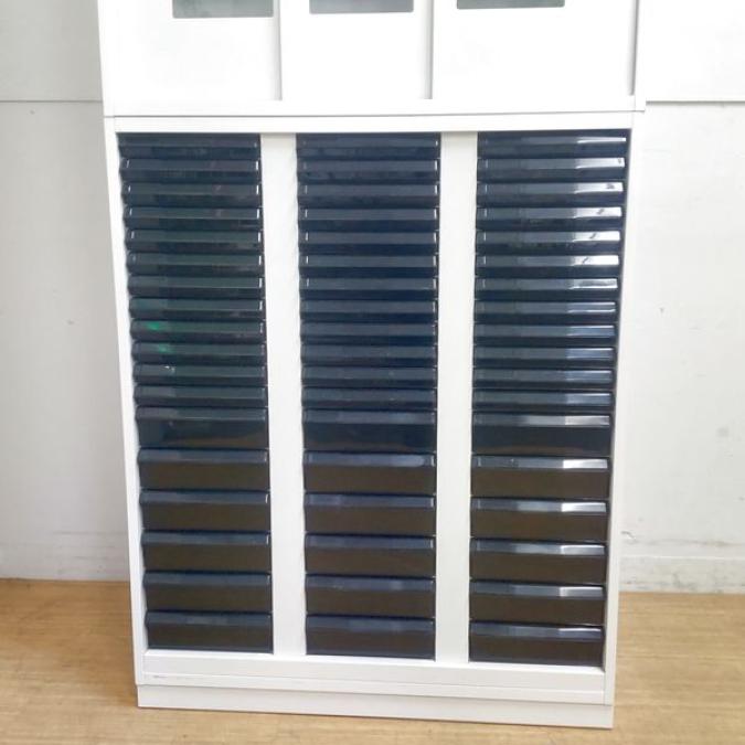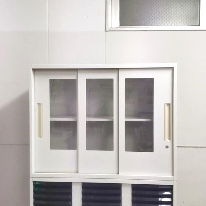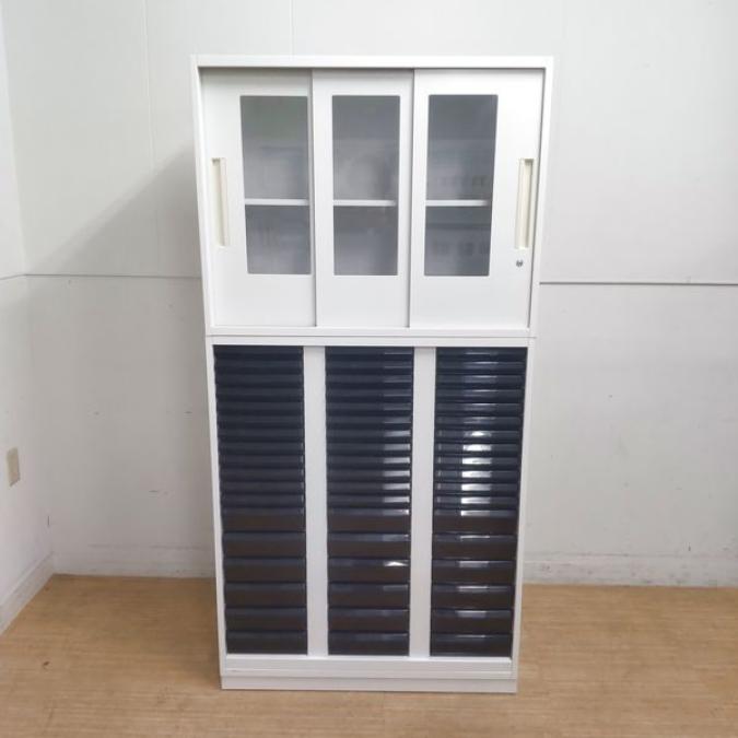 スモークトレーキャビネット3列(A4浅型12段+A4深型6段) + 透明3枚引違い の上下セット 【使用感ありお安く】 内田洋行 HSスタンダードタイプ 【収納】【鍵付き書庫】- 名古屋千種店