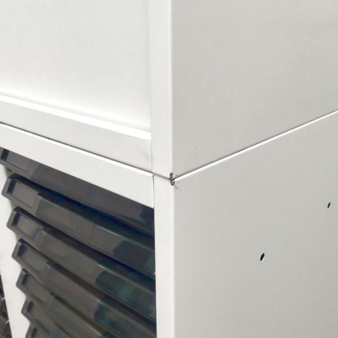 - 扉や引出しに、ラッチ機構を装備。地震時に勝手に扉や引出しが開き、収納物がユニットから飛び出すのを抑制します。