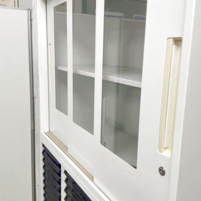 【中身を確認できる!人気のガラス書庫入荷!】 ■内田洋行/HSシリーズ(ハイパーストレージ)/ホワイト 上:ガラス引戸 + 下:両開き書庫セット