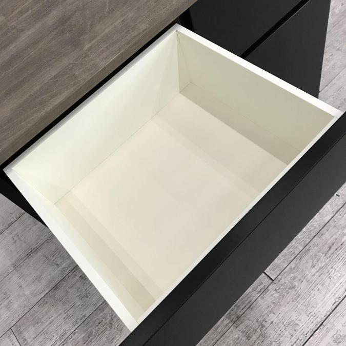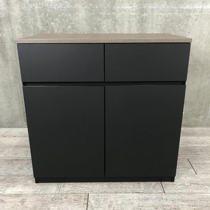 ブラック本体と木目ダーク天板の組み合わせがオシャレな収納キャビネットです。