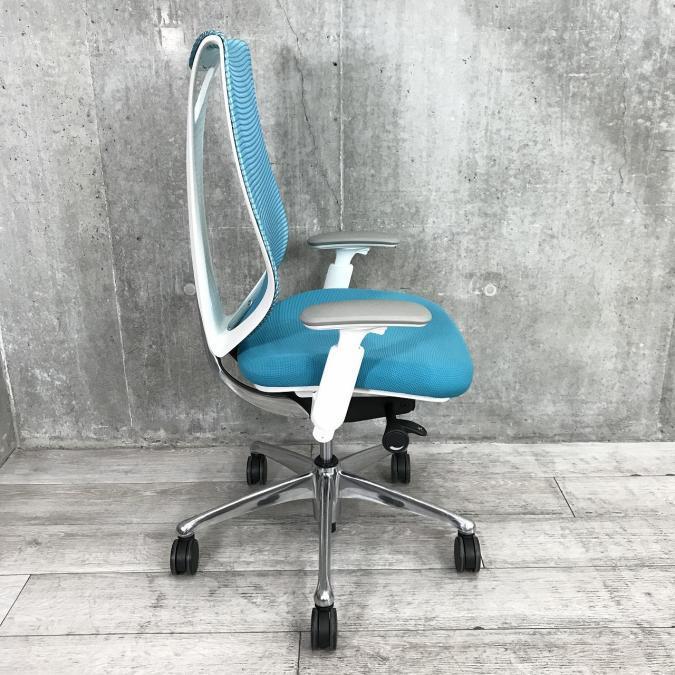 【T11】【T9】【K7】【商品入替のため、残り5脚限り】オカムラ製 サブリナシリーズ アクアブルー 背もたれ/アクアブルーx座面/ダークブルーのツートンカラー ホワイトフレーム アジャストアーム※可動肘 前傾チルト付 流れるような美しいフォルムの最高級メッシュチェア! 肘付きハイバックチェア!!