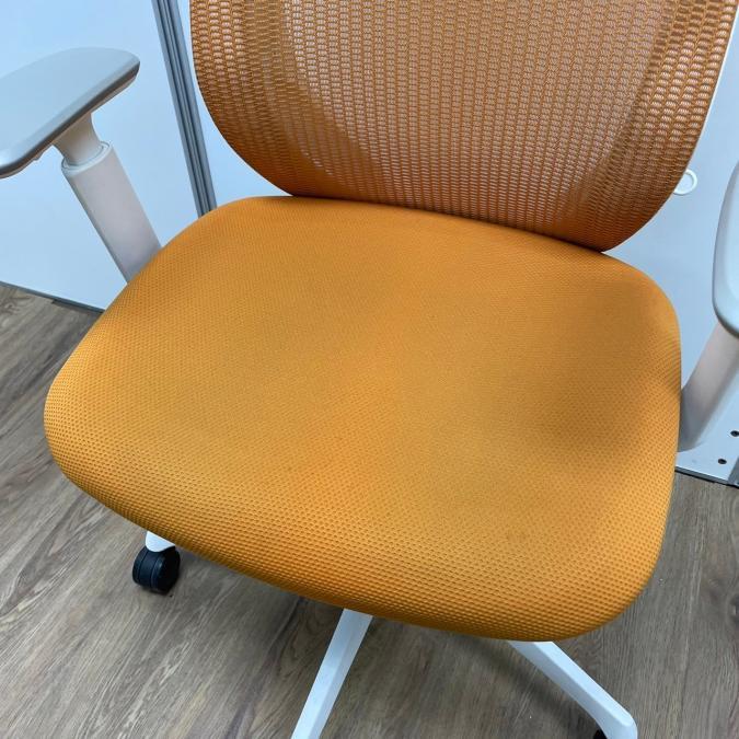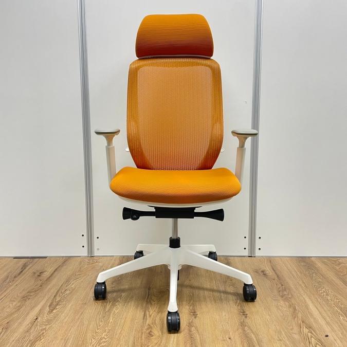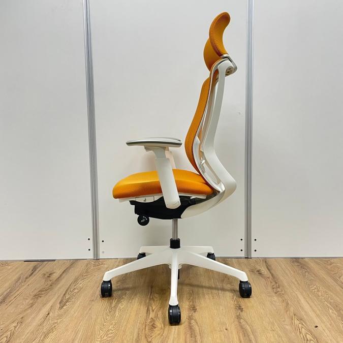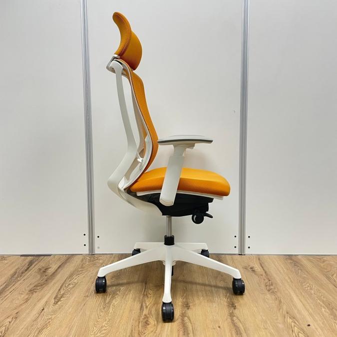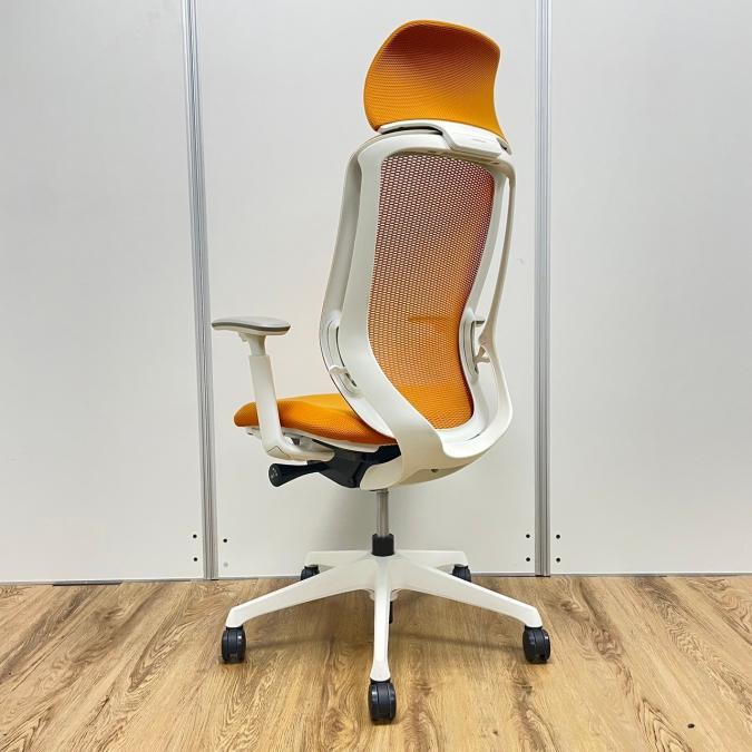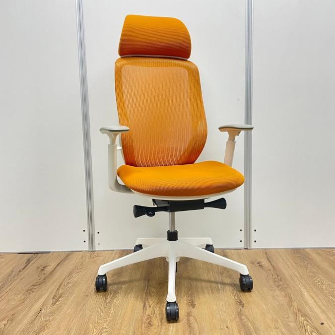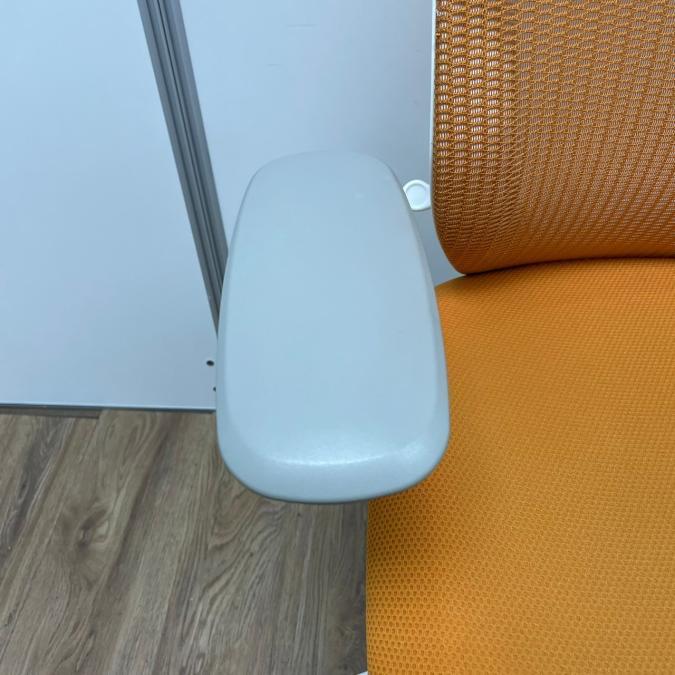 【残り1脚限り】オカムラ製 シルフィーシリーズ オレンジカラー ホワイトフレーム ヘッドレスト 可動肘 肘付きハイバックチェア!!※京都東寺店画像※- 京都東寺店