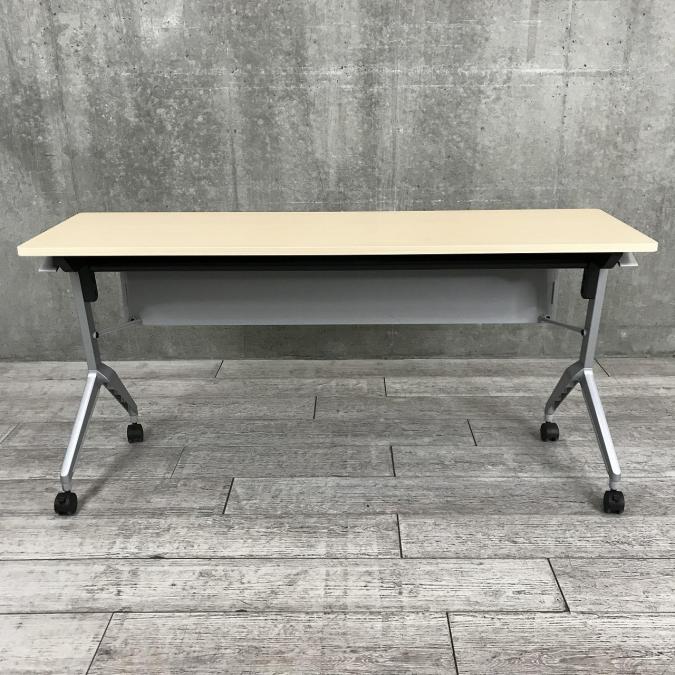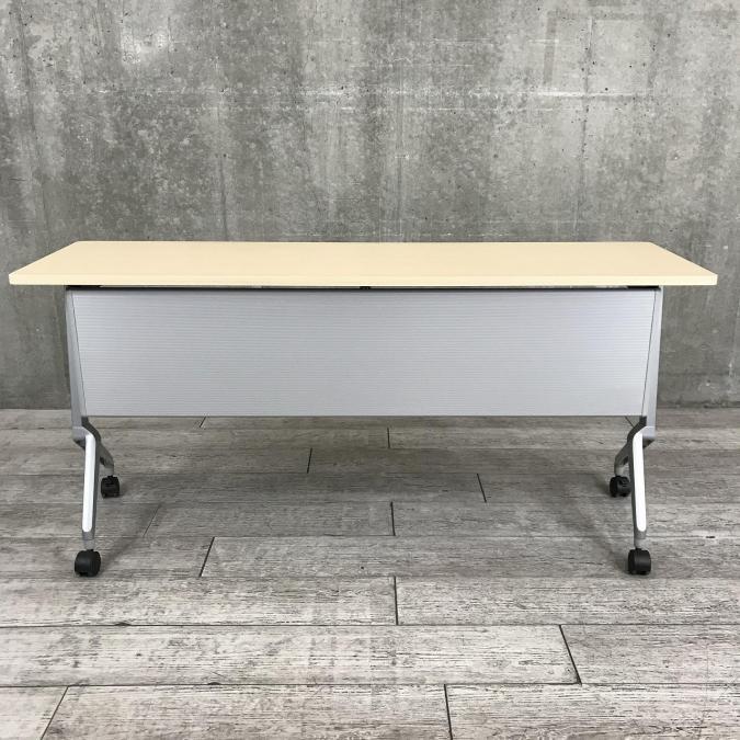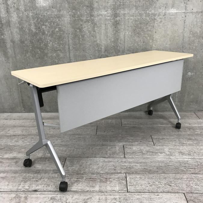 【会議・研修室などに・使わないときは畳んで省スペース!】■コクヨ(KOKUYO)製 リーフライン(Leafline)シリーズ サイドスタックテーブル フラップテーブル W1800×D600㎜ ■木目ナチュラル天板 ■幕板付き 【2~3名での使用に最適】