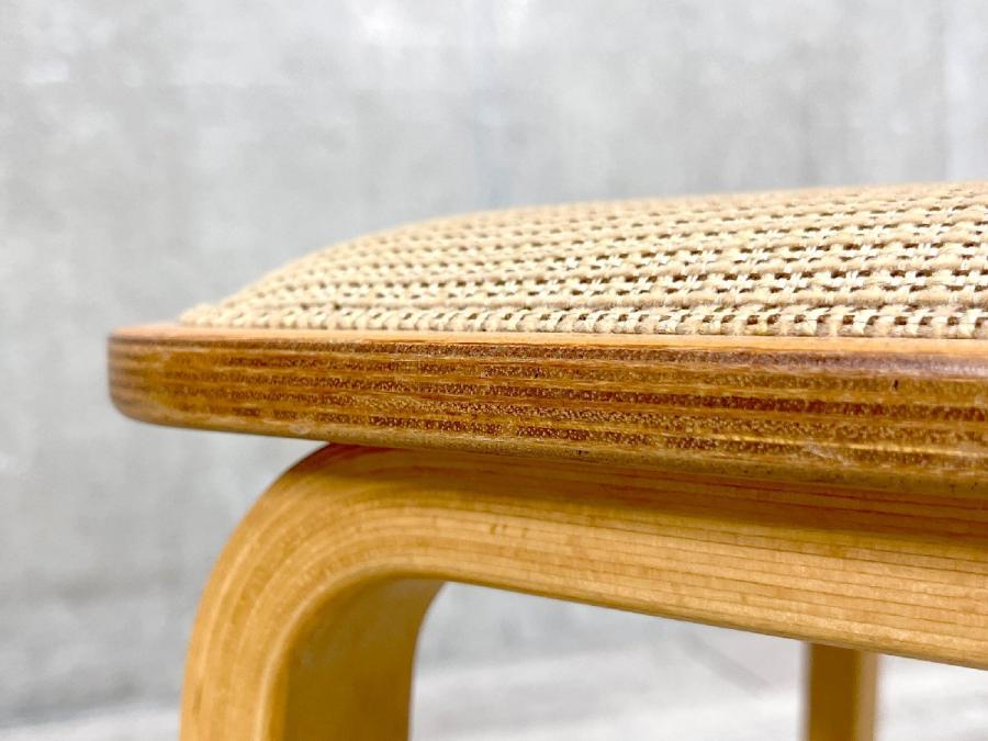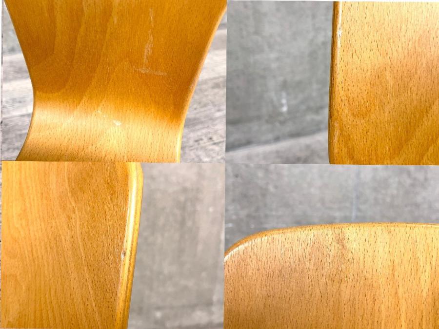 前脚から後脚へと一体となった部材、座面、背もたれとわずか3つのパーツで作られていますが、それでいて3字曲面に曲げられた背もたれが背中にフィットし、適度な弾力もあり座り心地も考えられた椅子です。