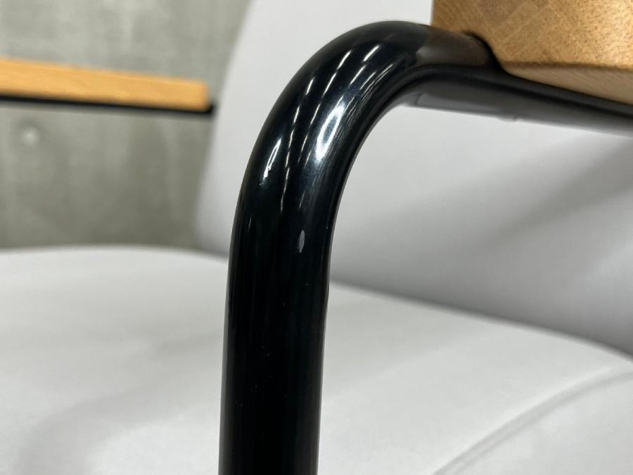 エンジニアでもあったプルーヴェは、椅子に座った時、後脚に最も負担がかかるという椅子の本質を見抜きデザインしました。かかる重さが比較的軽い前脚には細い鋼のチューブを使い、より大きな重さがかかる後脚には、太さをもたせた中空の鋼板を用いる事で椅子にかかる重さを床へ逃がせる構造になっています。