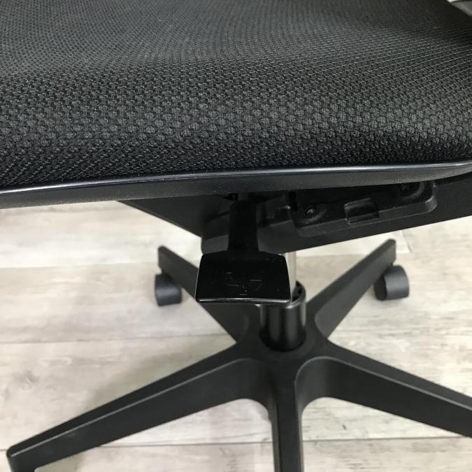 例えば、座面は、イトーキ独自の"ベンディングシート"という機構により、クッション、インターシェル、空洞という三層構造になっています。 この真ん中に挟まっているインナーシェルが、着座時の姿勢に合わせて体重を分散してくれるので、どんな姿勢でも体になじみ、疲労を軽減してくれます。 さらに、座面は前後に4センチほど奥行きを調整でき、前傾姿勢で座りたい、深く腰掛けたい、膝裏を圧迫されたくないなど、個人の好みに合った快適さにカスタマイズが可能となっています。