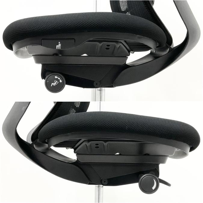- 座面の左にあるレバー操作により、座面の奥行き調整が可能です。(ストローク:50mm)