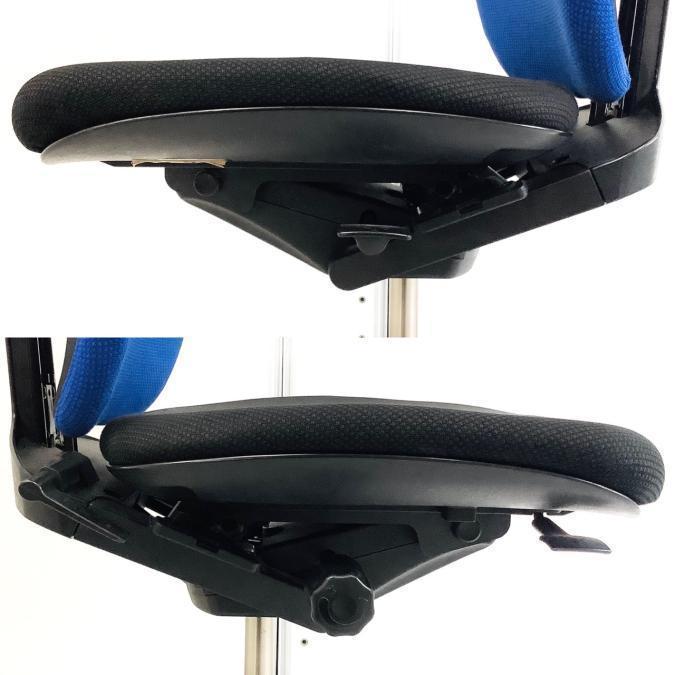 例えば、座面は、イトーキ独自の"ベンディングシート"という機構により、クッション、インターシェル、空洞という三層構造になっています。 この真ん中に挟まっているインナーシェルが、着座時の姿勢に合わせて体重を分散してくれるので、どんな姿勢でも体になじみ、疲労を軽減してくれます。 さらに、座面は前後に4センチほど奥行きを調整でき、前傾姿勢で座りたい、深く腰掛けたい、膝裏を圧迫されたくないなど、個人の好みに合った快適さにカスタマイズが可能となっています。
