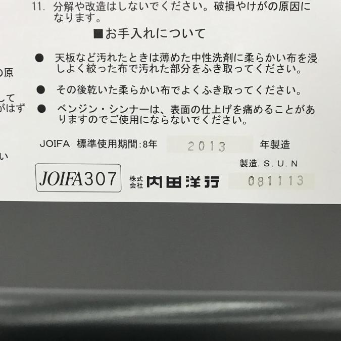 - あり黄ばみ・変色が広い範囲にうっすらある、または濃い黄ばみ・変色が一部ある。(例、天板、幕板、棚板、サイド部分、脚部等にある。)