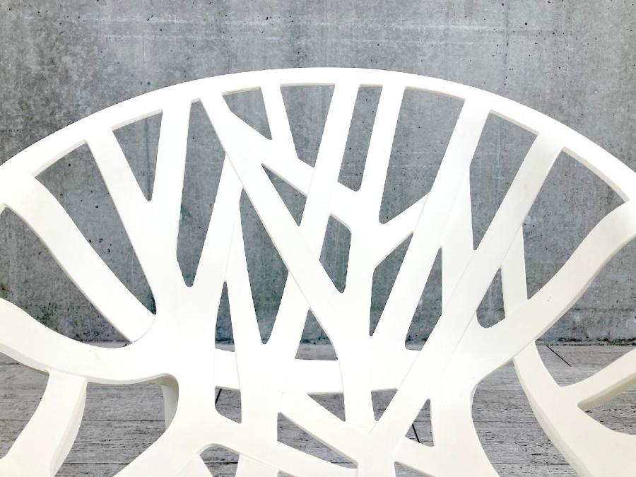 葉脈をモチーフにしたようなポリアミド製の成型シェルが特徴で、屋内外で使用可能。3脚までのスタッキングに対応するマルチガーデンチェアです。