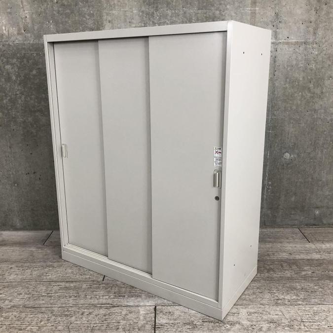 【お問い合わせの多い引違い書庫が入荷!スライド引き戸だから開閉スペースに困りません!】■オカムラ(okamura)製 レクトラインシリーズ 3枚引き戸タイプ 引違い書庫 ローキャビネット ■シリンダー錠 ■ニューグレー【2508】弊社使用欄【A01029264】