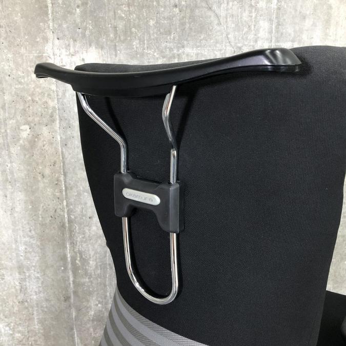 - 背もたれの裏側にハンガーがついているので上着などを形よく掛けられ、袖や裾が床に付きにくくなります。