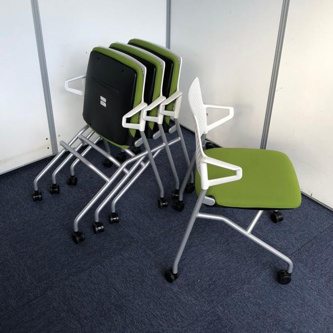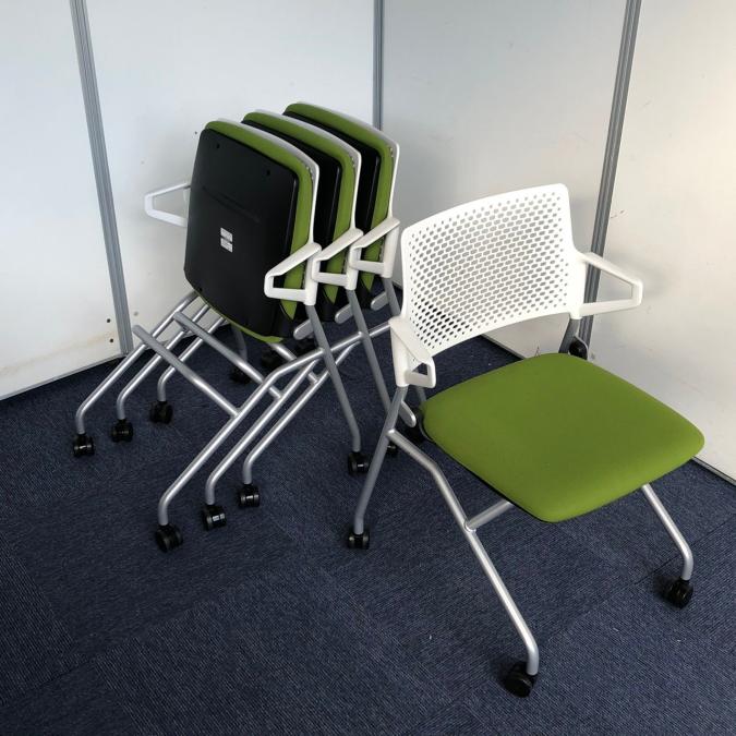 【スタイリッシュなスライドスタックチェア!シンプルデザインで様々なミーティングシーンにぴったりフィット!】■ウチダ製 FM345 肘無ネスティングチェア ■座面グリーン×ホワイト背面 ■キャスター付 ■背面樹脂メッシュ