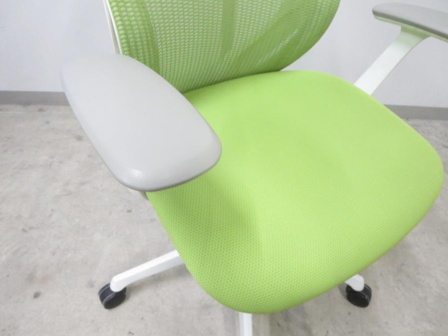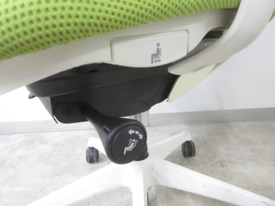 【いま人気のワーキングチェア!新感覚のオフィスシーティング!】■オカムラ シルフィーチェア 可動肘付 ライムグリーン ハンガー付 ※肘に擦れがあるためお安く!【前傾チルト機能付】【A01040979】