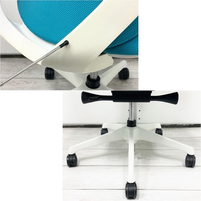 - 座面左下のダイヤルでリクライニングの固定と解除が行えます。 前傾ポジションをとることも可能です。