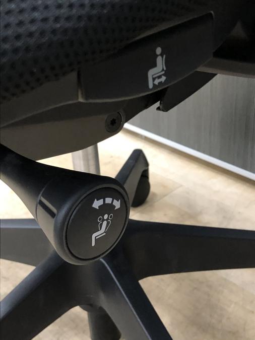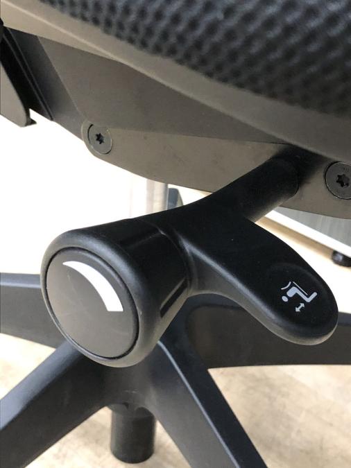 - 座面右下のダイヤル操作で、リクライニングの強弱調整が行えます。これまでのダイヤル式よりも、少ない回転数で、最弱?最強の調整が可能です。