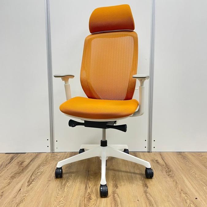 【3脚入荷予定】オカムラ製 シルフィーシリーズ オレンジカラー ホワイトフレーム ヘッドレスト 可動肘 樹脂脚 肘付きハイバックチェア!!- 京都東寺店