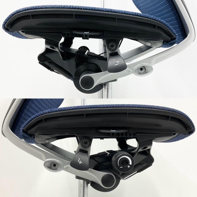 両手を自然に下ろした位置にあるレバーにて、座面の前後スライド調整(前後50mm)が可能です。