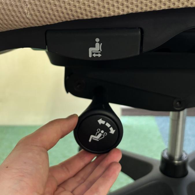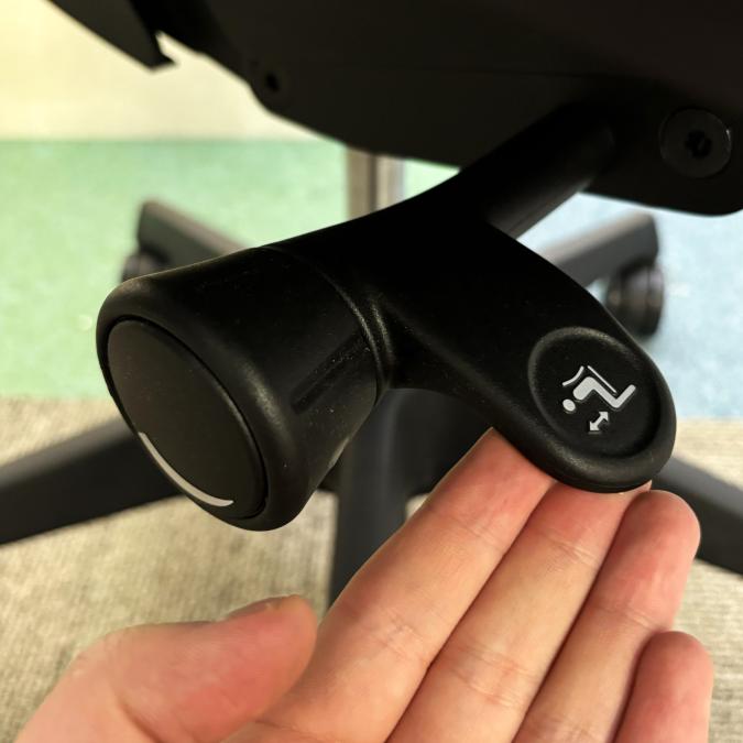 - 座面右下のダイヤル操作で、リクライニングの強弱調整が行えます。これまでのダイヤル式よりも、少ない回転数で、最弱?最強の調整が可能です。