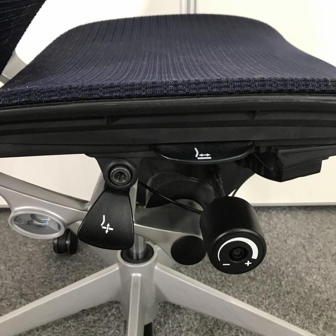 両手を自然に下ろした位置にあるレバーにて、座面の前後スライド調整(前後50mm)が可能です。