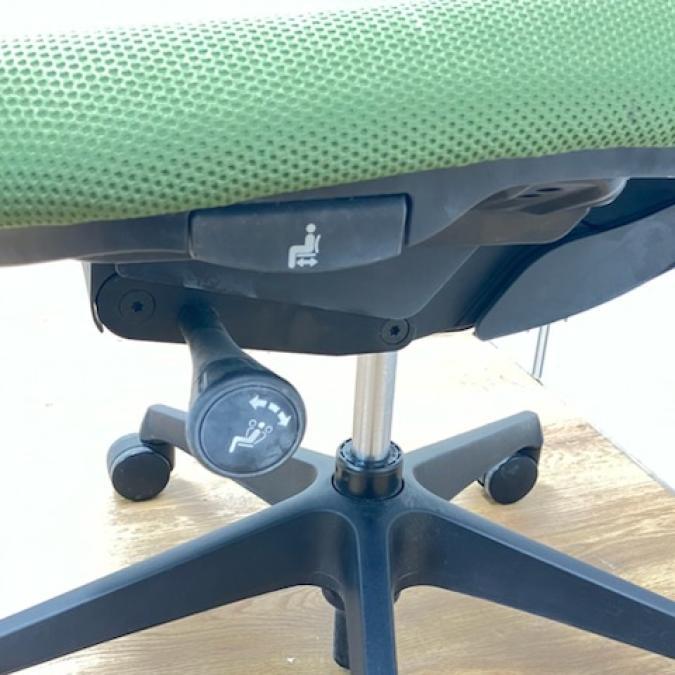 - 座面左下のダイヤルでリクライニングの固定と解除が行えます。 前傾ポジションをとることも可能です。