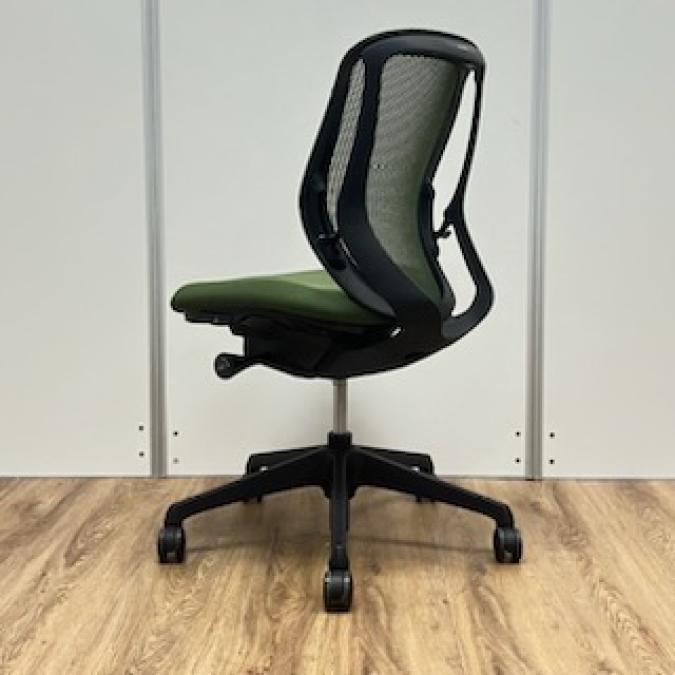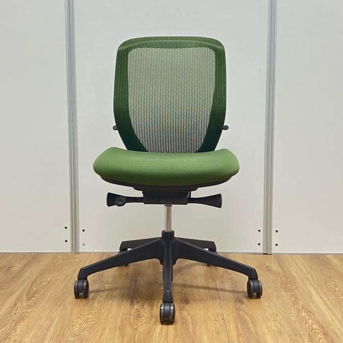 【商品入替のため、残り2脚限り】オカムラ製 シルフィーシリーズ 背メッシュ ダークグリーン ブラックフレーム 前傾姿勢 樹脂脚 肘無しローバックチェア!!- 京都東寺店