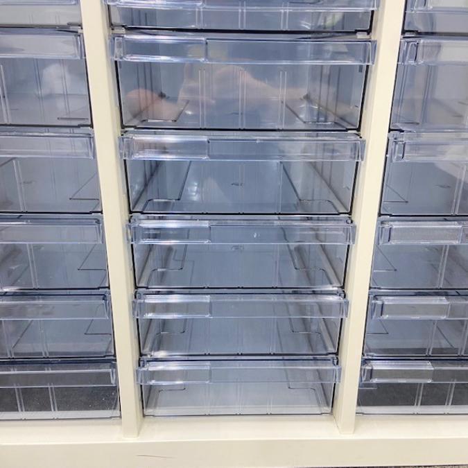 【書類・備品整理の必需品!書類や備品のストックにピッタリ!※1段目のみ浅型仕様】オカムラ レクトライン クリスタルトレー 書類 引き出し 透明 ケース ローキャビネット 整理 中古家具 オフィス家具 福岡 九州最大級《オフィスバスターズ福岡博多店は、福岡を拠点として、日本全国へ中古オフィス用品・オフィス家具を提供しております》