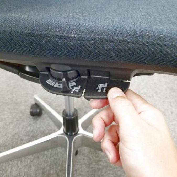 - 座面の高さ調節や背と座がシンクロしてスライドするアンクルチルトリクライニングなど、基本的な調節機能を搭載。