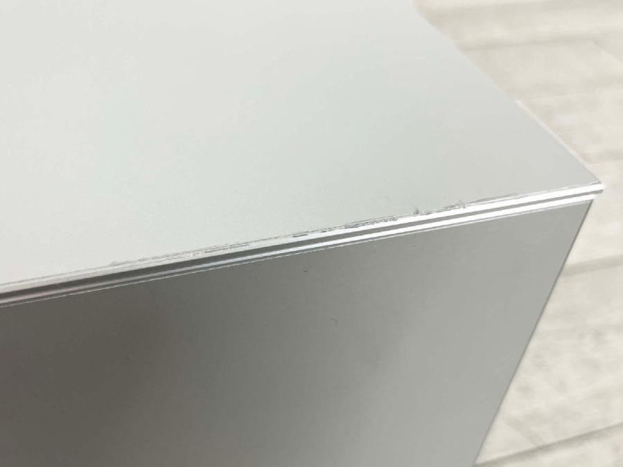 - 目立つ箇所複数あり深い傷・凹みが商品全体にある。(例、天板、幕板、棚板、サイド部分、脚部等にある。)
