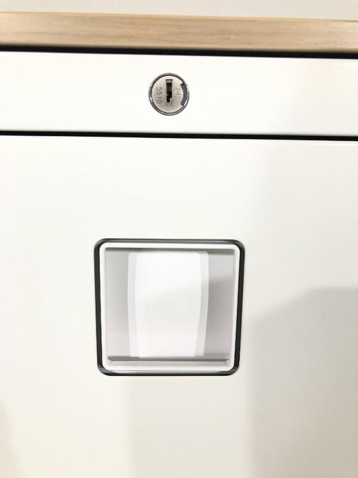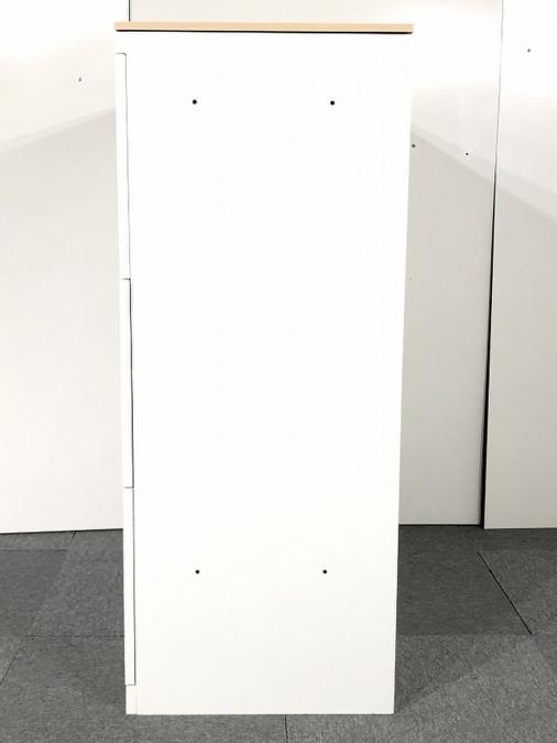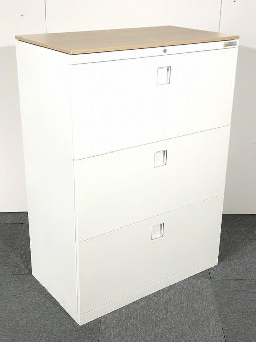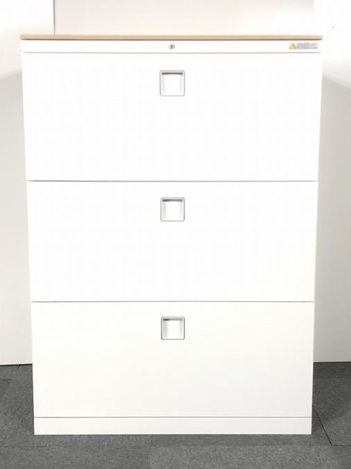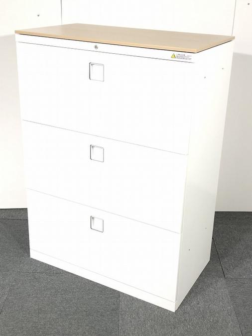 オカムラ レクトライン 3段ラテラル書庫 ホワイト天板 シリンダー錠 鍵付き ※取っ手部分に若干日焼けあり