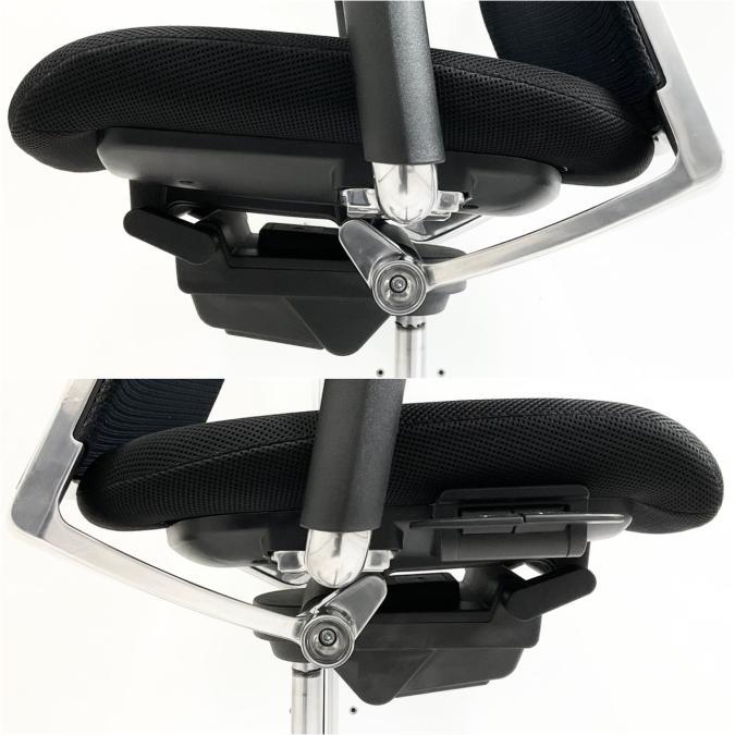 - 座る人の体格に合わせて、シート奥行きは前後54mm、高さ100mmの調整が可能です。また、調整レバーを座面シートの側面に設けることで、座ったままの姿勢で操作することができます。