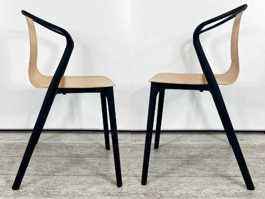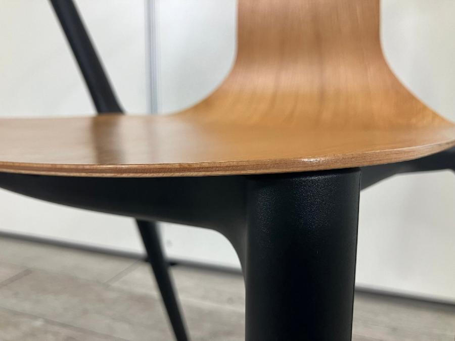 この椅子の最大の特徴はシートシェルです。シートシェルは、ベルヴィルチェアのアイデンティティとなる部分であり、素材や色に応じてイメージが変化します。スレンダーな黒のフレームは、脚や背面に向かって書道の線を思わせるようなラインを描いています。一方シートシェルは、広めの座面が背もたれにかけて細くなっていき、非常に薄いシェルを支えています。