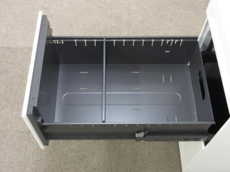 引き出しが3段あり、中段下段はA4サイズが入りますのでオフィス用としての収納量も申し分ございません。
