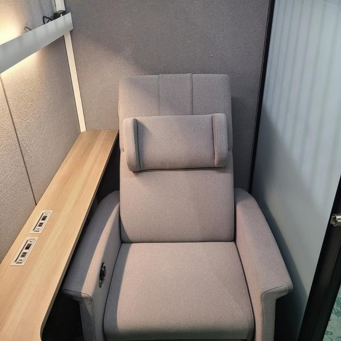 内側には専用のテーブルと照明が取付、専用のワークナップチェアを設置しています。