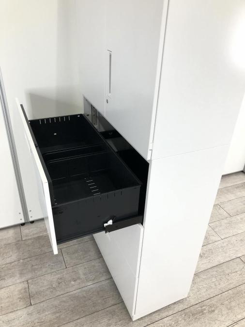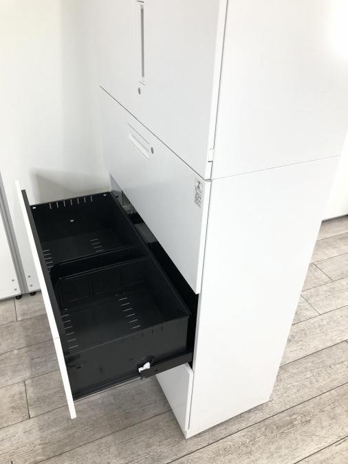 - 両開きタイプは扉が180度開き、通路の邪魔になりません。ラテラルタイプは引出しが限界まで出せ、出し入れ楽々。