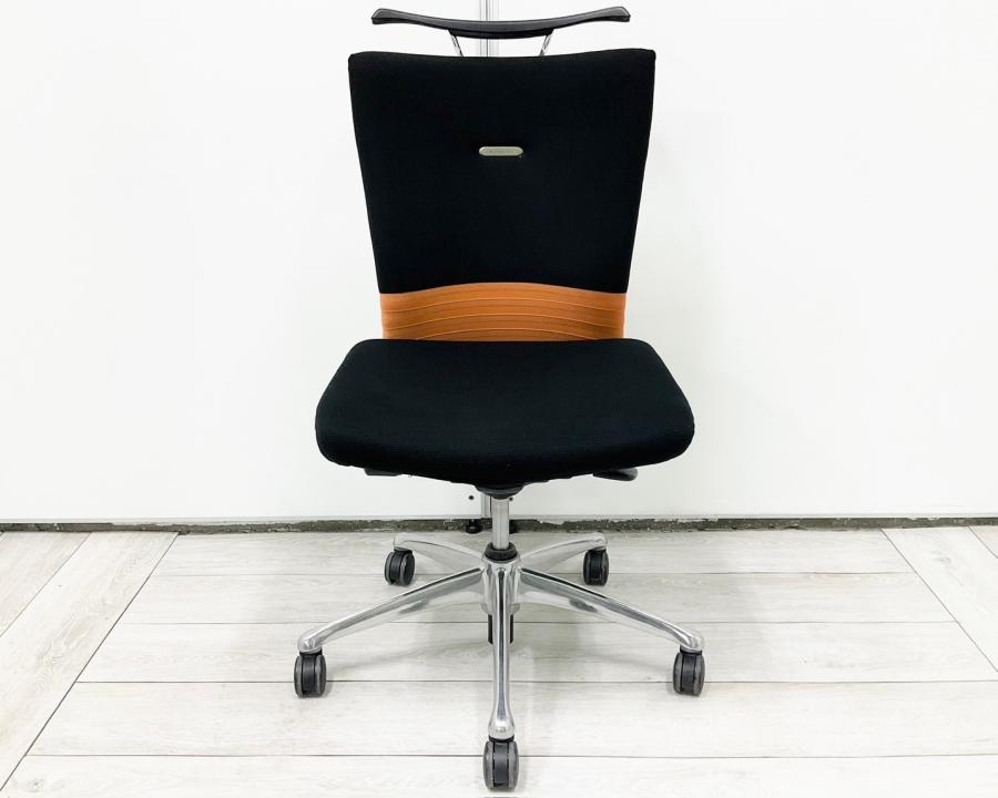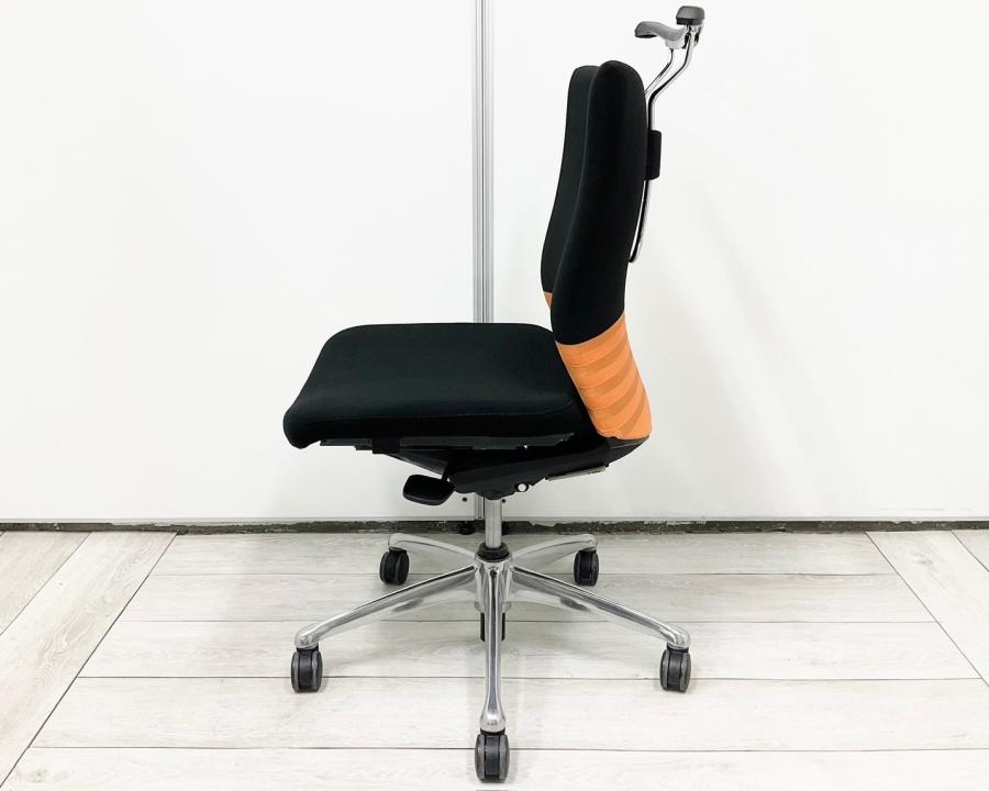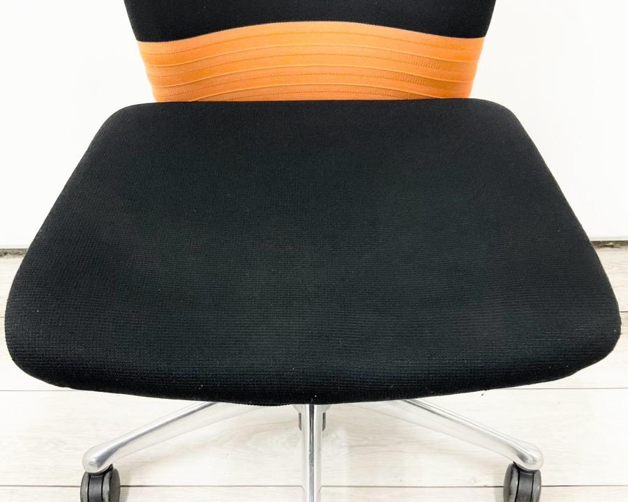 【人間工学に基づいた快適な座り心地!背あてのしなやかな曲線が背中にフィット!】■オカムラ製 フィーゴチェア (feego) 肘無ミドルバック シームレスタイプ ■肘無 ■ブラック×オレンジ ※コートハンガー外し跡のある商品となります。【入替セールにつき30%OFF!】