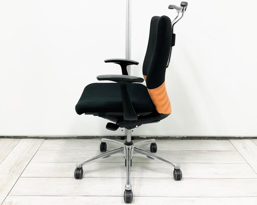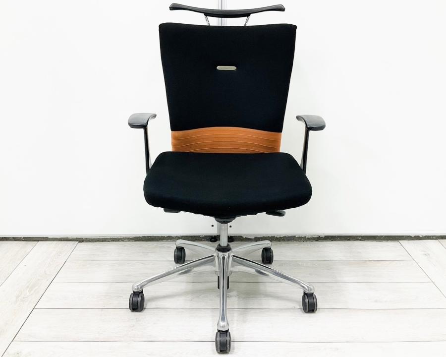 【人間工学に基づいた快適な座り心地!背あてのしなやかな曲線が背中にフィット!】■オカムラ製 フィーゴチェア (feego) 肘付きミドルバック シームレスタイプ ■固定肘 ■ブラック×オレンジ ※コートハンガー外し跡のある商品となります。【入替セールにつき30%OFF!】