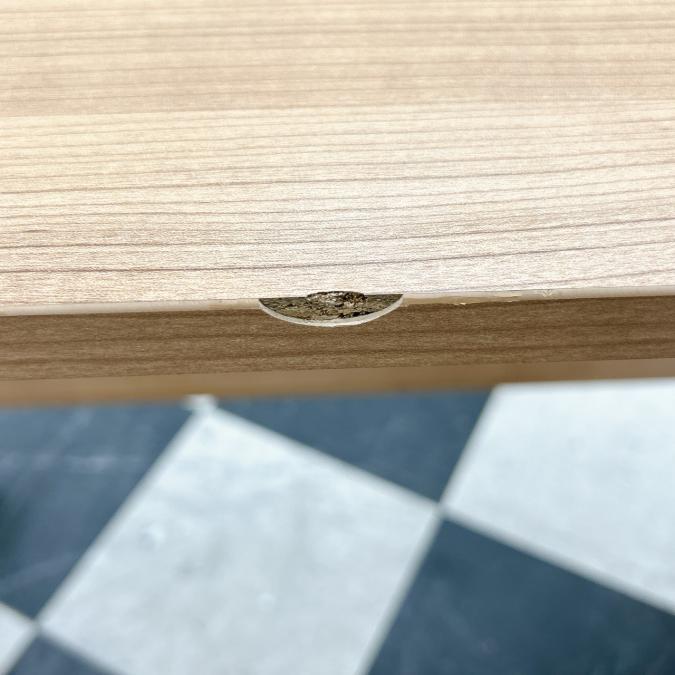 - 目立つ箇所あり傷・凹みが多数、深い傷・凹みが一部ある。(例、天板、幕板、棚板、サイド部分、脚部等にある。)