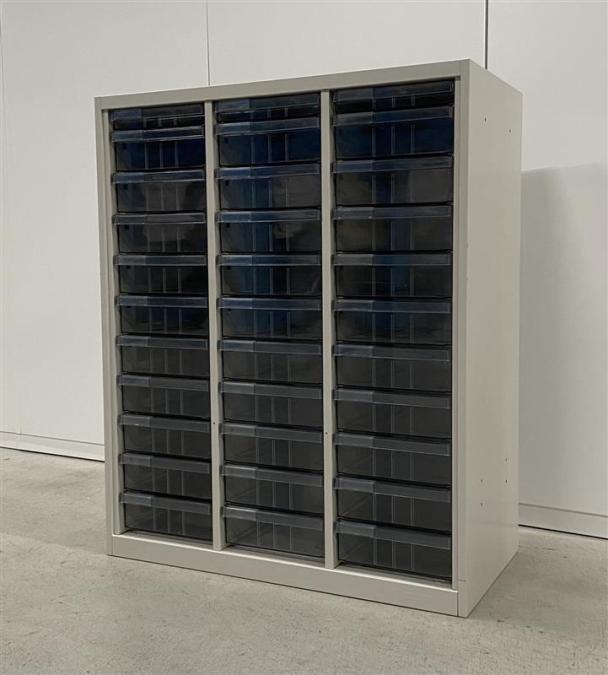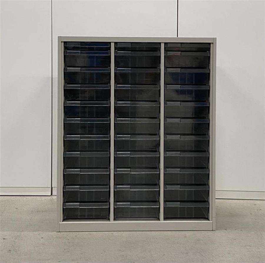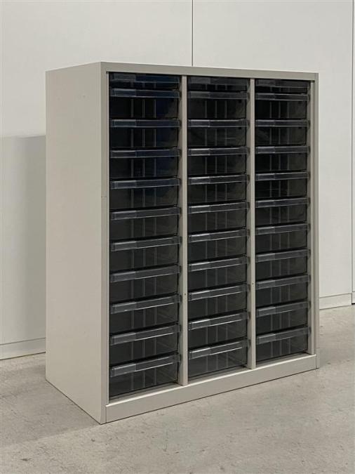 A4用紙サイズの深型トレー30個、浅型トレー3個(上段)、計33個のトレーとなっております。