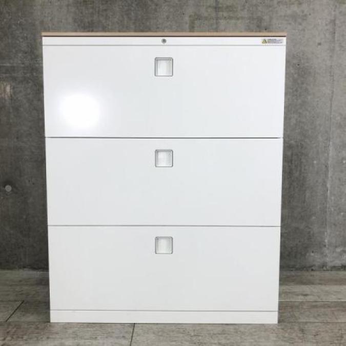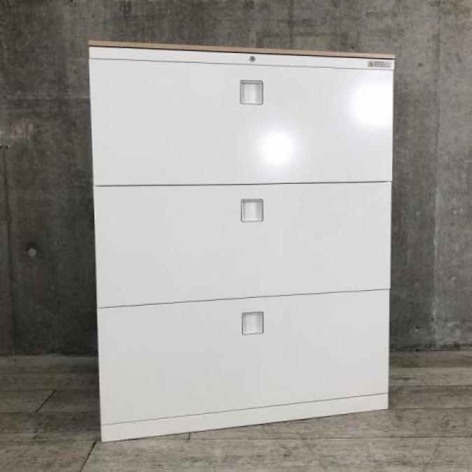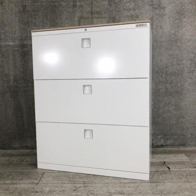 【ファイル収納にオススメ!高品質で使いやすい人気シリーズの3段ラテラル書庫!】■オカムラ(okamura)製 レクトラインシリーズ 3段ラテラル書庫 ローキャビネット H1100㎜ ■ホワイト ■シリンダー鍵 ■天板付き(天板:ホワイト) ※日焼け有