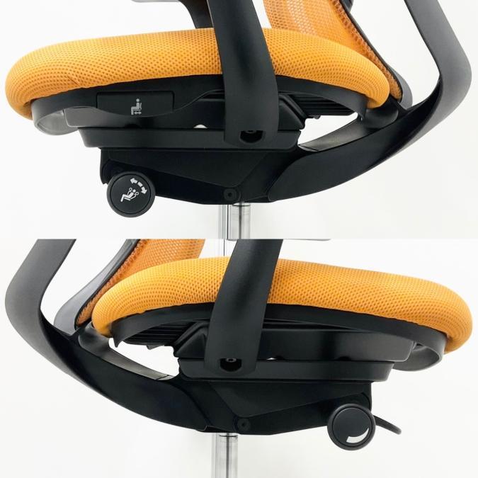 - 座面右下のダイヤル操作で、リクライニングの強弱調整が行えます。これまでのダイヤル式よりも、少ない回転数で、最弱?最強の調整が可能です。