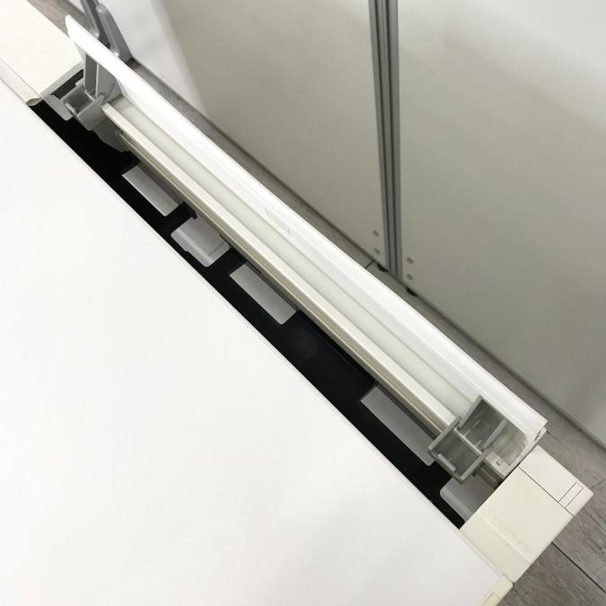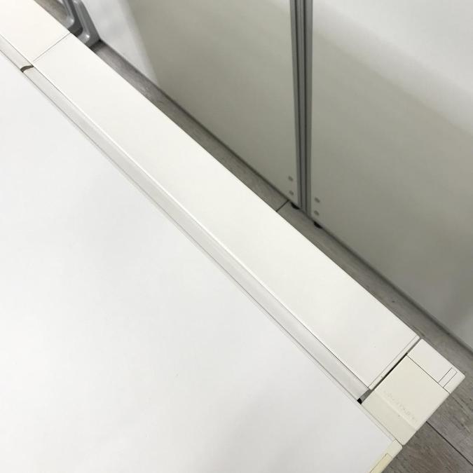 デスク後方をすっきりと見せる幕板を標準装備、脚は足元にゆとりを生み出すL脚タイプとなります。
