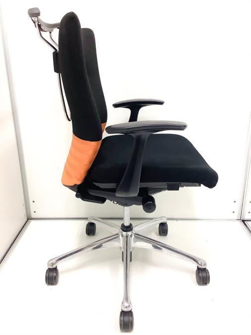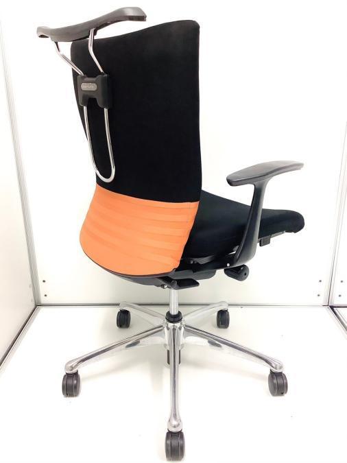 【人間工学に基づいた快適な座り心地!背あてのしなやかな曲線が背中にフィット!】■オカムラ製 フィーゴチェア (feego) 肘付きミドルバック シームレスタイプ ■固定肘 ■ブラック×オレンジ ※コートハンガー外し跡のある商品となります。【入替セールにつき30%OFF!】