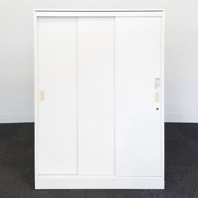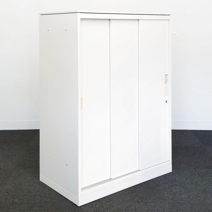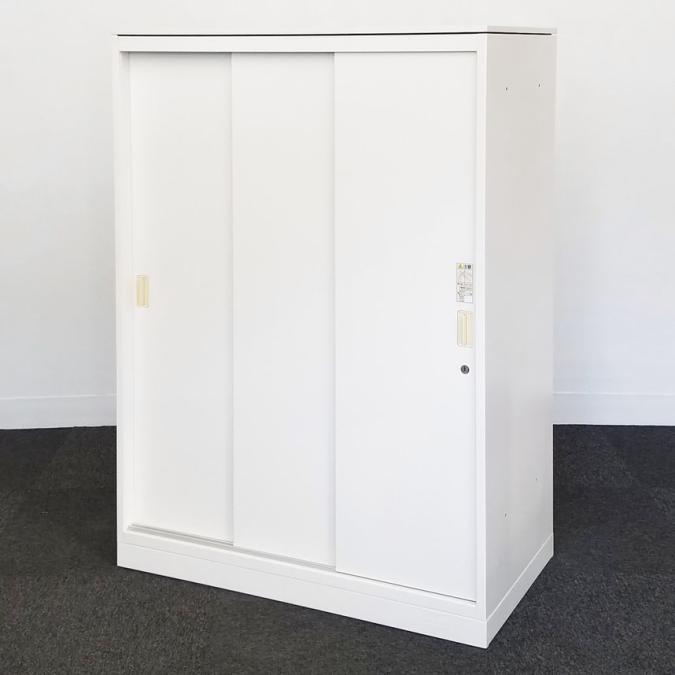 【物が取り出しやすい3枚引き違いタイプ!開閉スペースに困らない!】■オカムラ(okamura)製 レクトラインシリーズ 引違い書庫 3枚引き戸 ローキャビネット ■シリンダー錠 ■ホワイト ■ベース付き