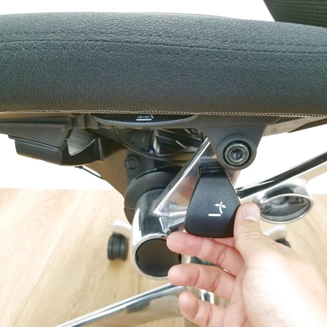 両手えお自然に下した位置にあるレバーで、座面の奥行きを前後に50mm調節出来ます。