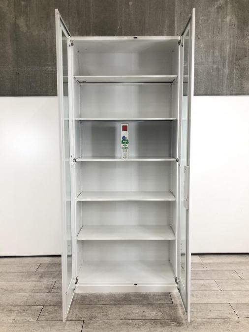 ガラス扉タイプの両開き書庫は収納物を外から確認でき、