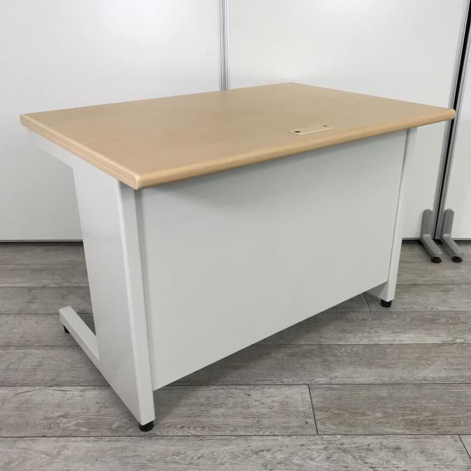 【コンパクトなサイズ!木目調の天板で温かみのあるオフィスに◎】 ■プラス(PLUS)製 フラットライン ■平机 幅1000mm 配線口 ■木目ナチュラル天板×ホワイト- 春日部・越谷店