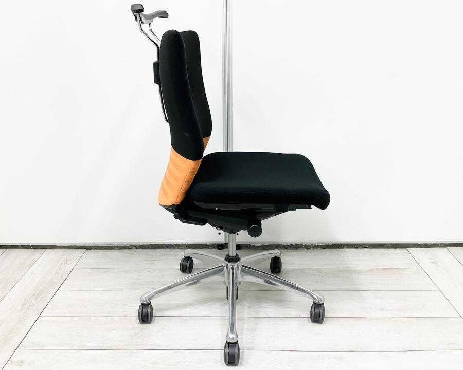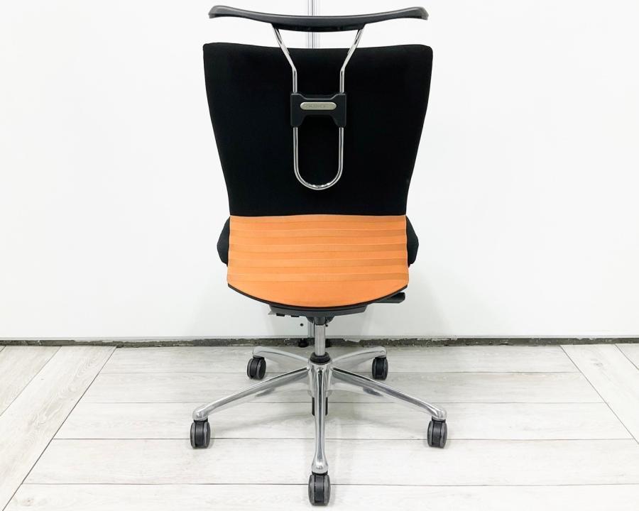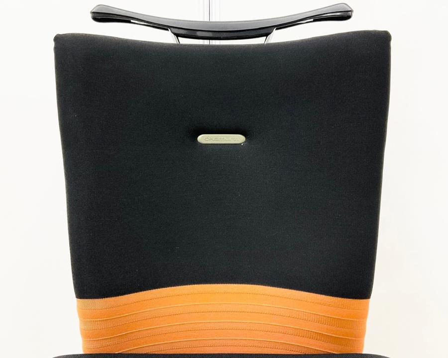 【人間工学に基づいた快適な座り心地!背あてのしなやかな曲線が背中にフィット!】■オカムラ製 フィーゴチェア (feego) 肘無ミドルバック シームレスタイプ ■肘無 ■ブラック×オレンジ ※コートハンガー外し跡のある商品となります。【入替セールにつき30%OFF!】