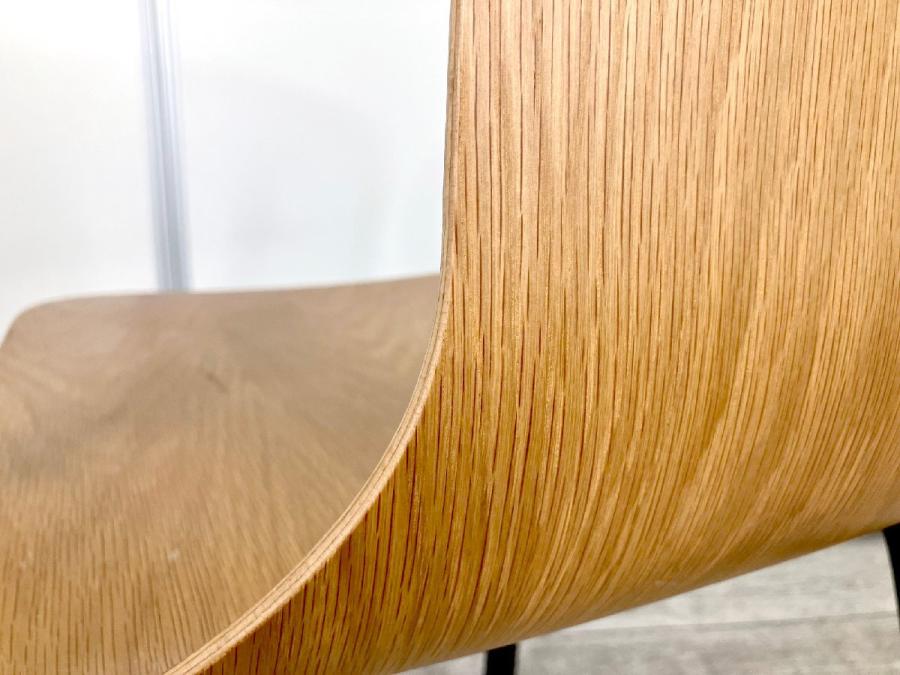 この椅子の最大の特徴はシートシェルです。シートシェルは、ベルヴィルチェアのアイデンティティとなる部分であり、素材や色に応じてイメージが変化します。スレンダーな黒のフレームは、脚や背面に向かって書道の線を思わせるようなラインを描いています。一方シートシェルは、広めの座面が背もたれにかけて細くなっていき、非常に薄いシェルを支えています。